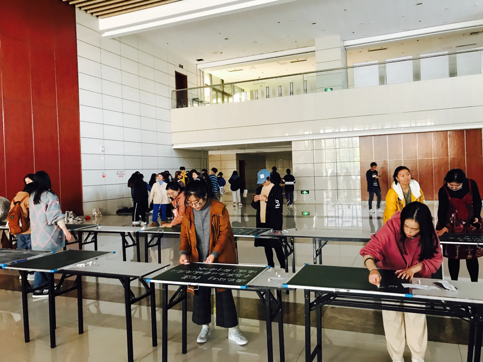 赛前,学生携带经院三宝之一的黑板到达现场,通过签到获取个人编号,比赛时以给定的文字为书写内容,进行为时一小时的书写。