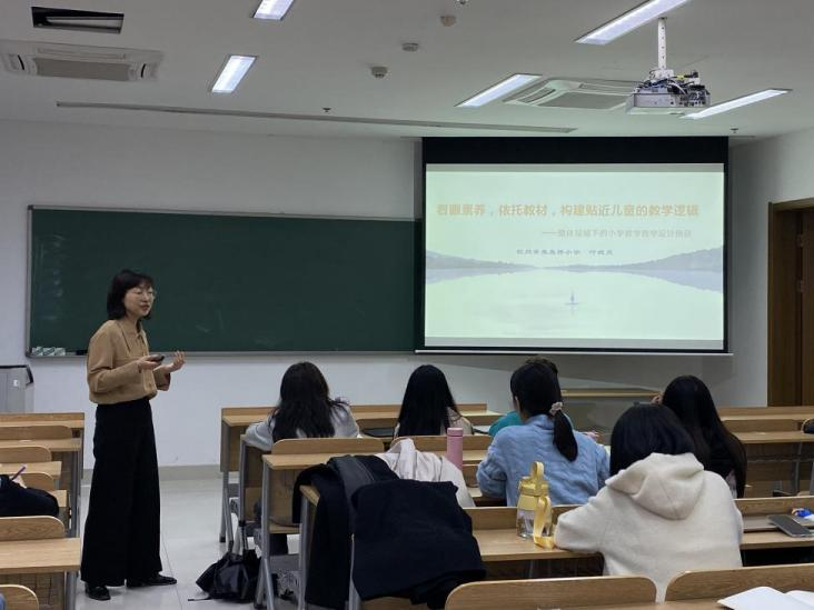 听完叶老师的讲座,同学们都感到受益良多。叶老师以身示范,做到了“眼中有学生,心中有教材”,整个过程与同学们互动融洽,用小学教材以及自己对教材的调整课例,向我们介绍了多种知识整合的视角,启示我们设计教学要基于学生真实起点确定学习方式,用整体眼光看教材,教学目标应指向学生素养的提升。