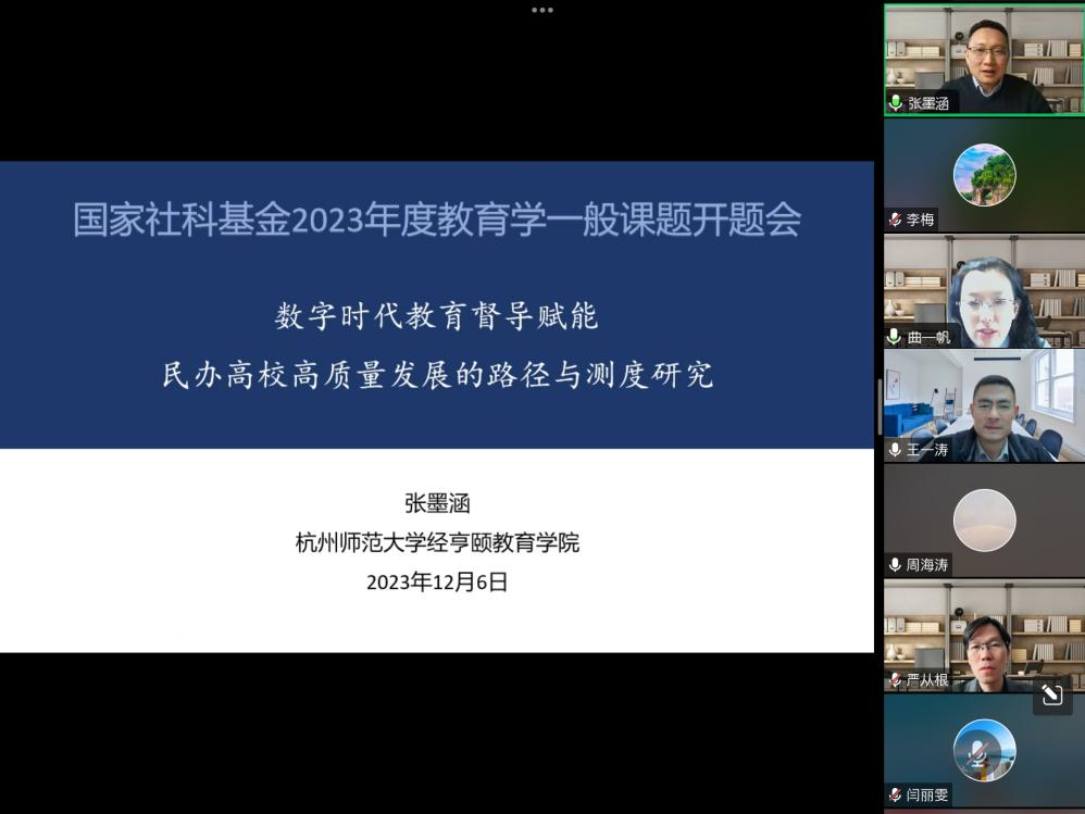 2023年12月6日,色情视频 张墨涵副教授主持的国家社会科学基金2023年度教育学一般课题《数字时代教育督导赋能民办高校高质量发展的路径与测度研究》(课题批准号:BIA230199)开题论证会在腾讯会议和色情视频 师生活动中心538会议室线上线下同步举行。参加开题论证会的专家有:北京师范大学高等教育研究院院长周海涛教授、华东师范大学高等教育研究所李梅教授、苏州大学民办教育研究中心主任王一涛教授、对外经济贸易大学教育与开放经济研究中心研究部主任曲一帆研究员、色情视频-色情视频在线看 执行院长严从根教授。论证会由严从根教授主持,北京师范大学高等教育研究院院长周海涛教授担任专家组组长。