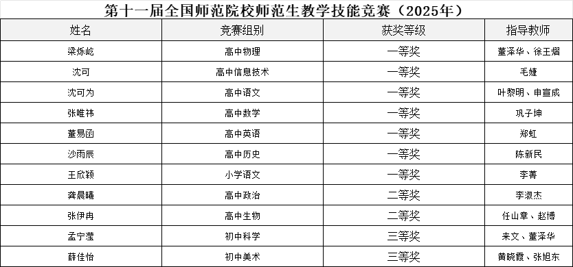 2025年11月29日至30日,由全国师范院校师范生教学技能竞赛组委会举办的第十一届“田家炳杯”全国师范院校师范生教学技能竞赛在浙江师范大学举行。“田家炳杯”全国师范生教学技能竞赛是目前国内师范生教学技能比赛中层次最高、规模最大、影响最广的全国性比赛,旨在为全国师范院校的师生提供互相交流和学习的平台,并通过比赛培养一批具有高尚师德、先进教学理念、扎实教学技能的优秀教师后备力量。本届比赛吸引了全国289所师范院校2345名选手参加初赛,经初赛评审,共有178所学校564名选手入围决赛。经过校赛、初赛、决赛的激烈角逐,我校选手斩获佳绩,展现了杭师大师范生的卓越风采,获奖名单如下: