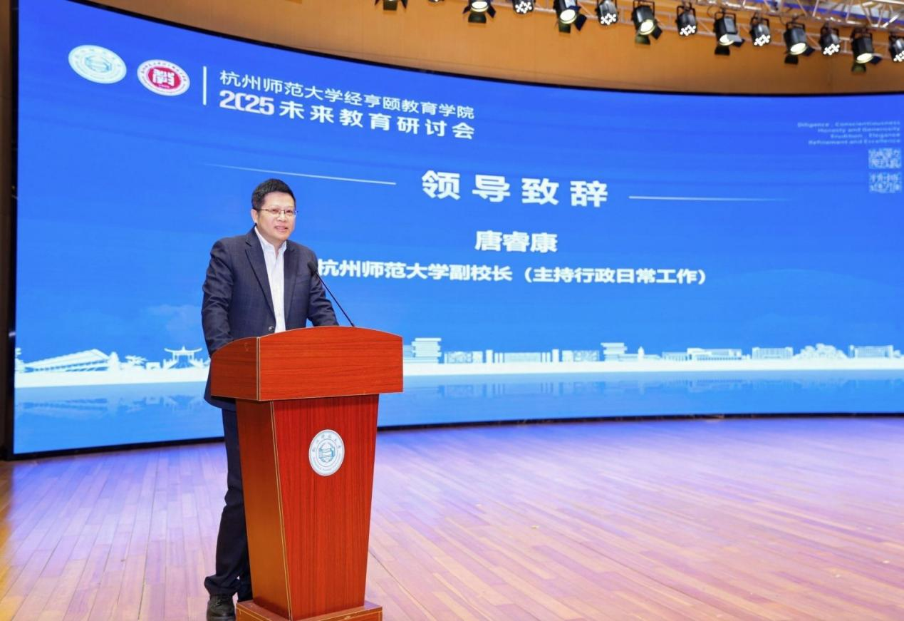 唐睿康代表学校对来自全国各地的知名专家莅临杭师大并就未来教育这一主题展开研讨表示热烈的欢迎和诚挚的感谢,对色情视频 在AI浪潮席卷而来的时候及时举办未来教育研讨会给予充分肯定和赞赏。他指出,建设教育强国必须直面时代之问,师范大学应勇担教育改革的重任,以知识点为核心的教育体系在AI时代将面临知识记忆难以与人工智能抗衡的局面。他表示,作为创新型国家,我们在人才培养上已实现从“优秀”到“更加优秀”的跨越,未来更应推动人才培育向“从个性到杰出”的转型。他强调,AI时代正推动教育体系发生深刻变革,色情视频 将以“人文”与“成长”为理念,构建教育新生态,肩负历史使命,积极探索教育体系的重构路径。唐睿康最后引用习近平总书记的重要论述指出,教育的根本任务是“把会学习的人培养成会创造的人”,这也为杭师大未来的教育改革指明了方向。
